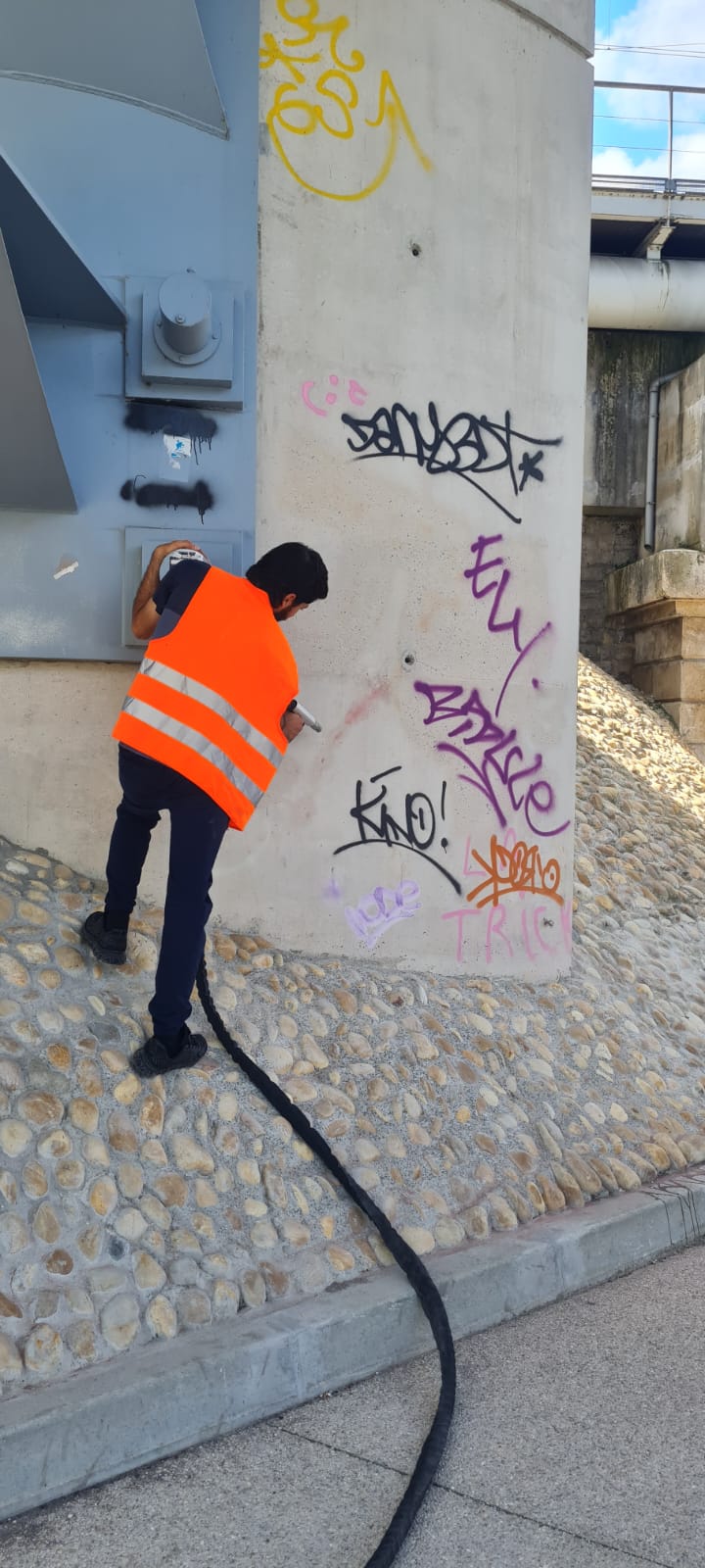 Problématiques courantes : Pollution carbonée, laitance de ciment, graffitis, traces de corrosion.
